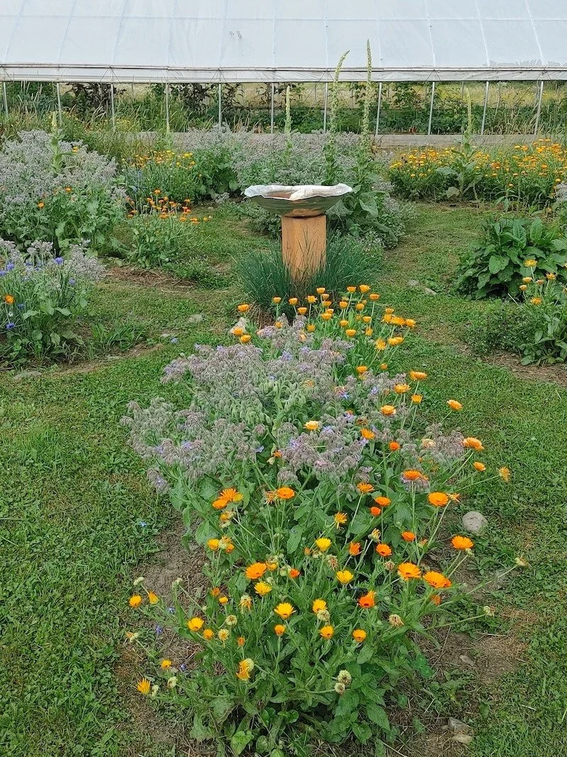The first garden I put in is filled with edible and medicinal flowers. Quartz stones begin each petal and ring the bird bath. There are Batchelor Buttons, Calendula, Peppermint, Chamomile, Lavender, Mullin, and chines as well as Barage.
